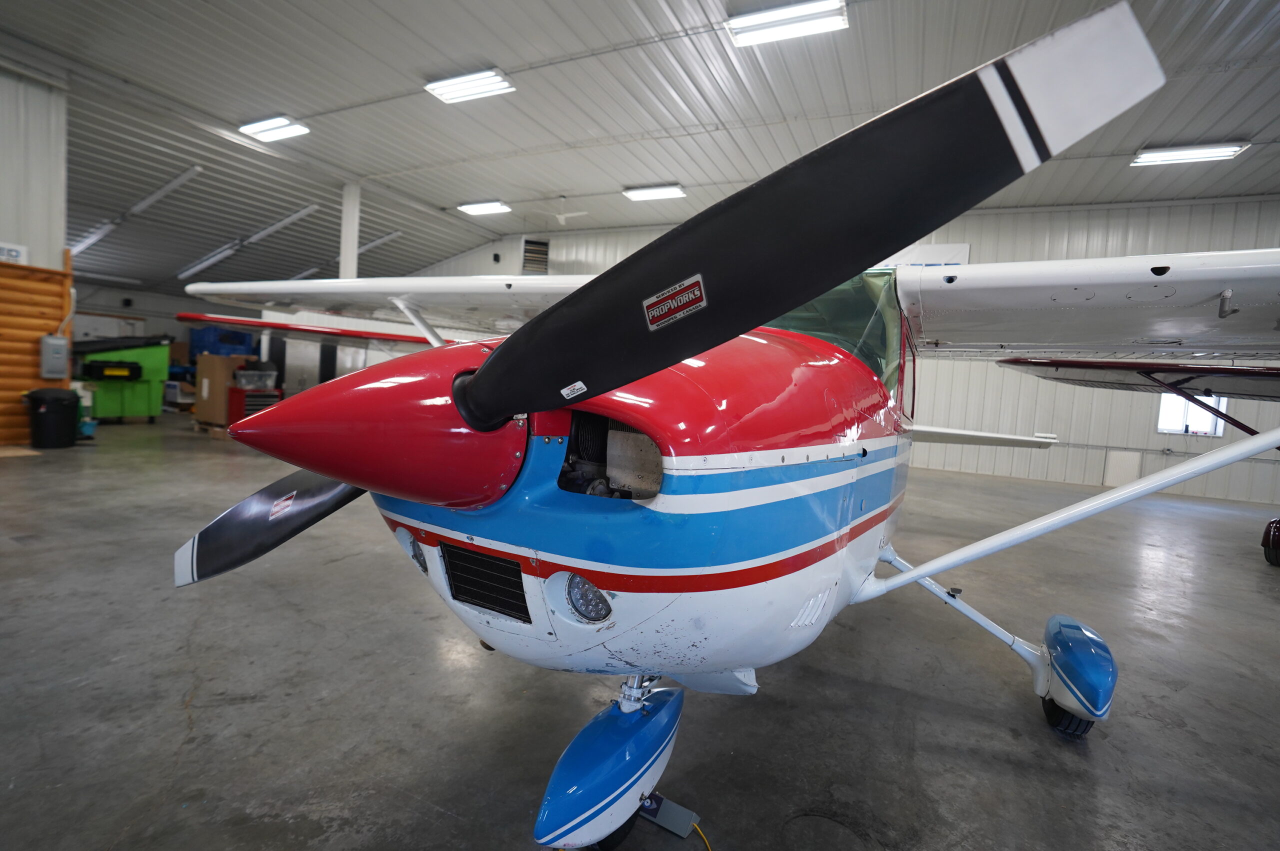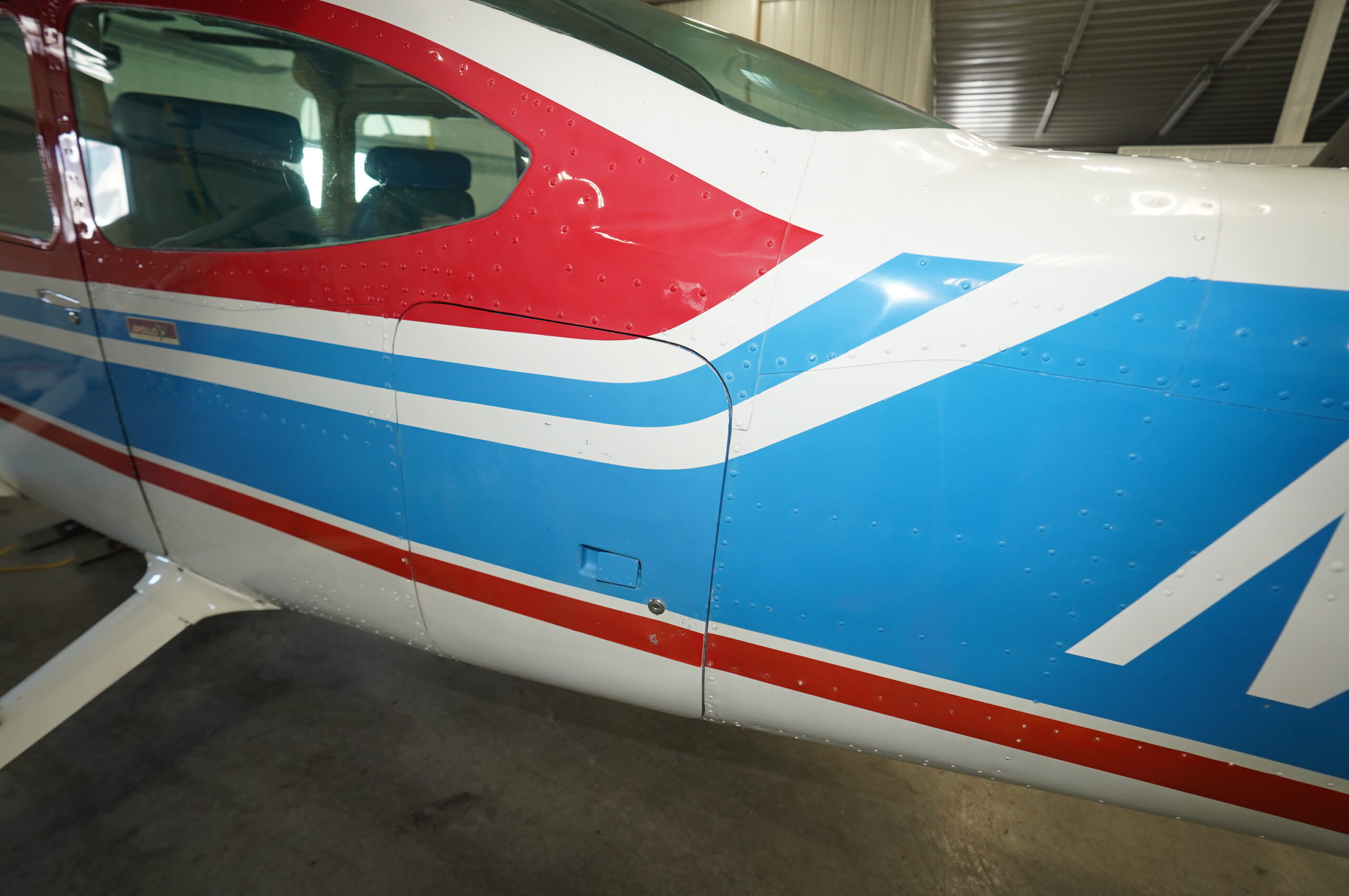 Paint: Factory Cessna scheme from 1974, overall white w/ blue and red striping, mostly original SNEW, mid 1990’s touch up work completed. Lower fuselage paint in original condition, areas of chipping present on lower cowl, lift struts and wheel fairings. Glass is original but in overall good condition.