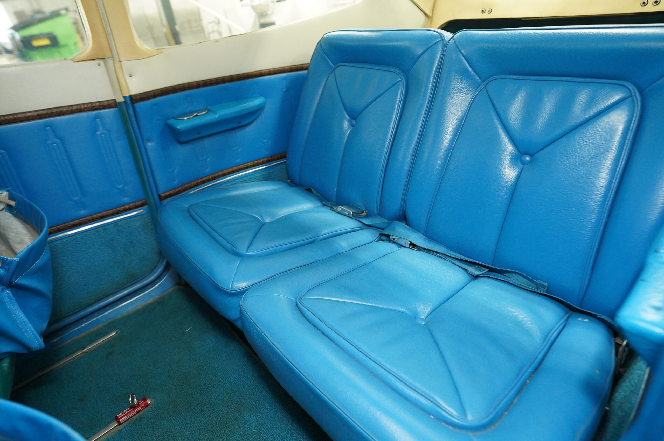 Interior: Factory original blue leather seating w/ coordinated carpeting/sidewalls/and blue plastic.