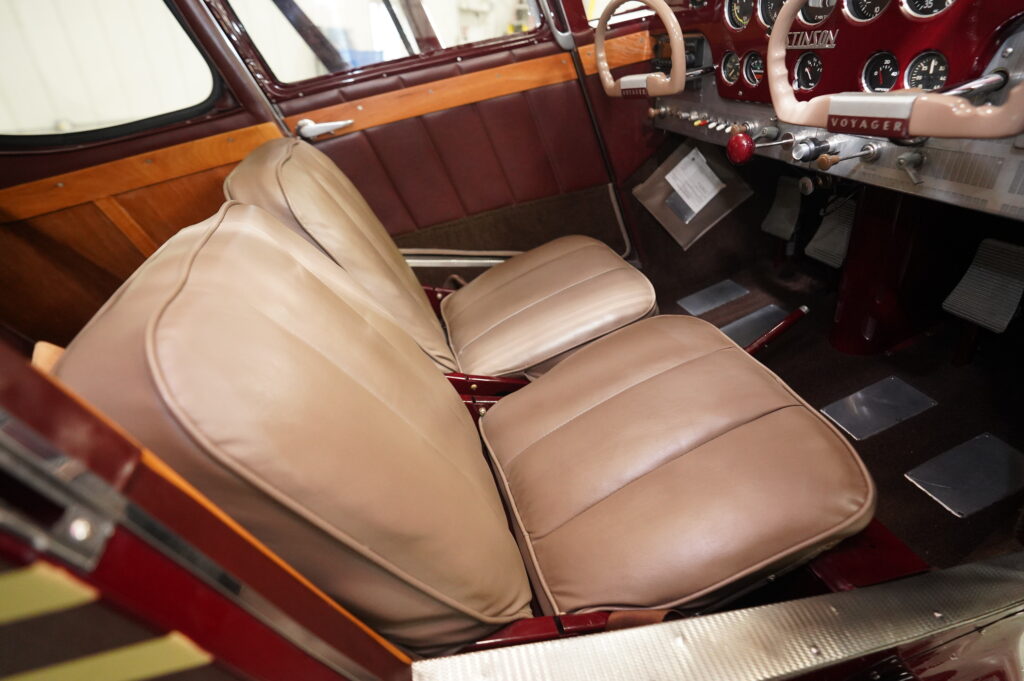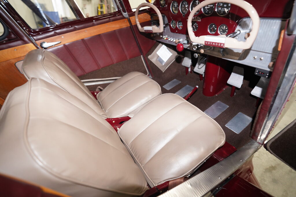 Interior: 10/10 completed during rebuild in 1999, pilot/co-pilot beige leather seating, 2nd row Maroon, coordinated sidewalls maroon / wood trim. Beautiful craftsmanship.