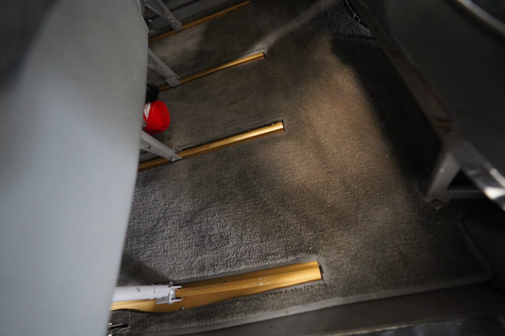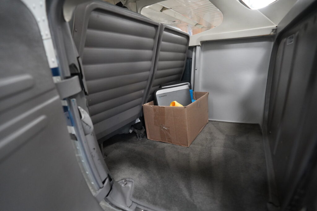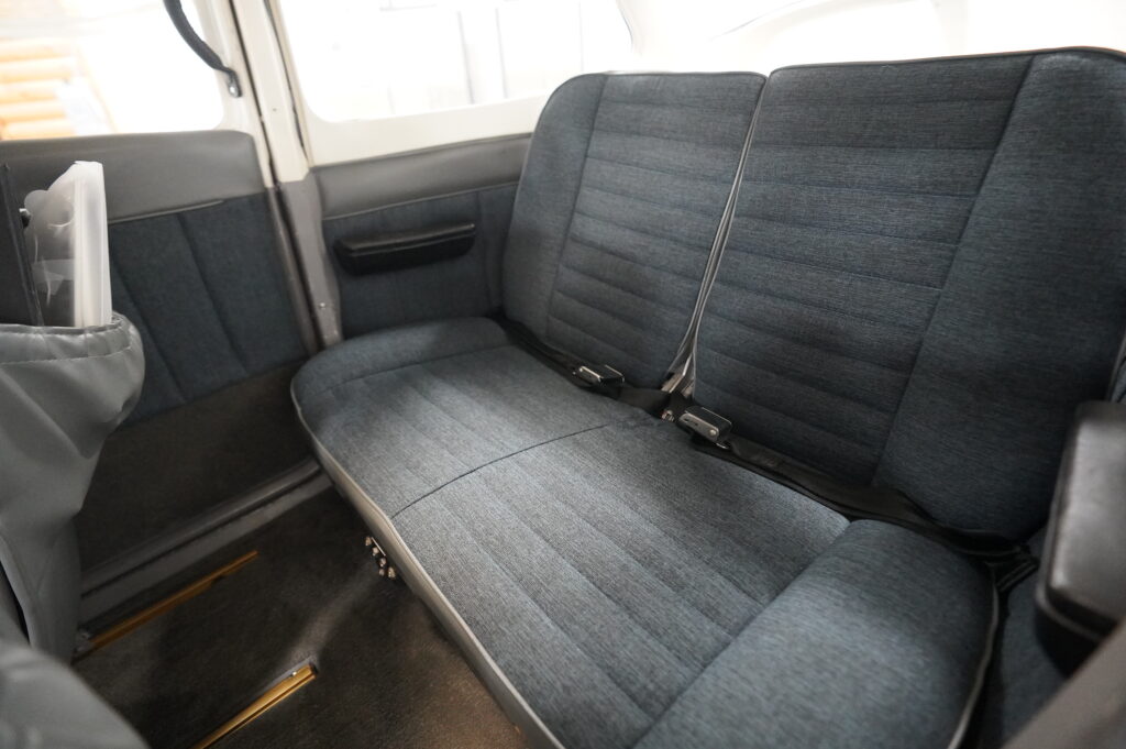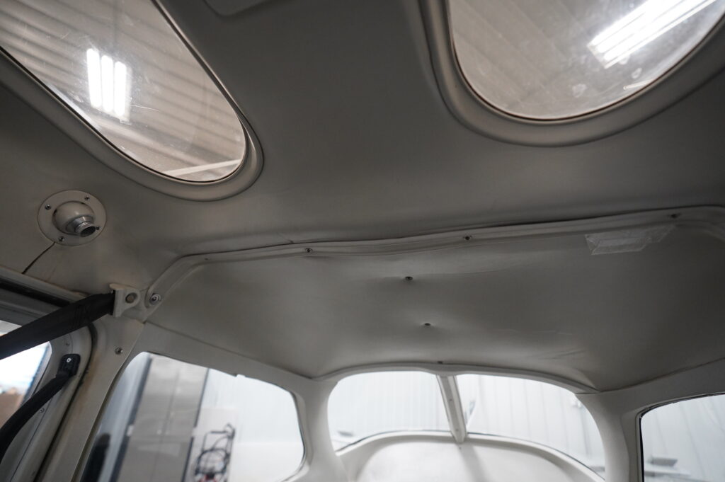 Interior: Custom Airtex interor completed in 2003, seats and belts show like new, overall medium gray and blue interior, gray carpeting in good condition, am safe belts w/ pilot/co pilot shoulder harnesses, beige headliner with sky lights, minor cracking on high use plastics, highly rated @ 8/10.